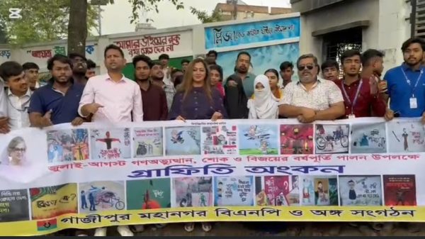 ছাত্র জনতার জুলাই-আগস্ট গণঅভ্যুত্থানের শোক ও বিজয়ের বর্ষপূর্তি উপলক্ষে বিএনপির কেন্দ্র ঘোষিত কর্মসূচীর অংশ হিসাবে গ্রাফিতি অংকন । টঙ্গী সরকারী বিশ্ব বিদ্যালয় কলেজের প্রাচীরে গ্রাফিতি উদ্ধোধন করেন গাজীপুর মহানগর বিএনপির