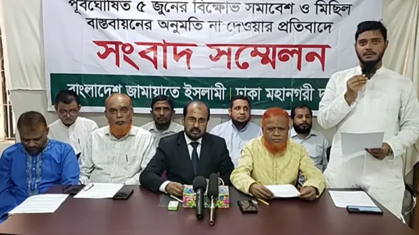 সংঘাত এড়াতে আজ ৫ই জুনের বিক্ষোভ সমাবেশের কর্মসূচি স্থগিত ঘোষণা করেছে জামায়াত। একইসঙ্গে আগামী ১০ই জুন শনিবার দুপুর ২টায় রাজধানী বায়তুল মোকাররমের উত্তর গেটে সমাবেশ ও বিক্ষোভ মিছিল পালনের নতুন