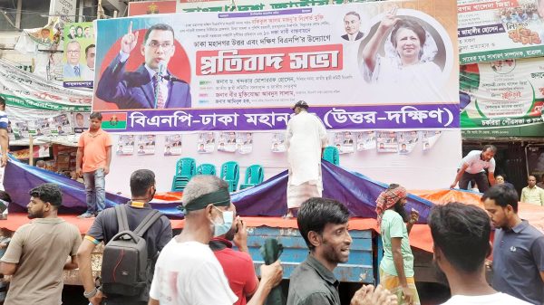 আকাশে কালো মেঘ, চারদিকে তীব্র গতিতে বইছে বাতাস। যেকোনো সময় নামতে পারে বৃষ্টি। এসবের মধ্যেও থেমে নেই নয়াপল্টনে পিকআপ ভ্যানে বিএনপির সমাবেশের অস্থায়ী মঞ্চ তৈরির কাজ। এরই মধ্যে রাজধানীর বিভিন্ন