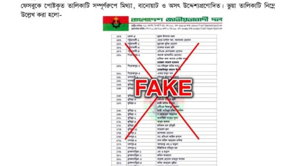 নিজস্ব প্রতিবেদক জাতীয় সংসদ নির্বাচনকে সামনে রেখে সামাজিক যোগাযোগমাধ্যম ফেসবুকে বিএনপির প্রার্থী মনোনয়নের একটি ভুয়া তালিকা ছড়ানো হয়েছে। এই মিথ্যা প্রচারণায় দলটির নেতাকর্মী ও সাধারণ জনগণকে বিভ্রান্ত না হওয়ার জন্য